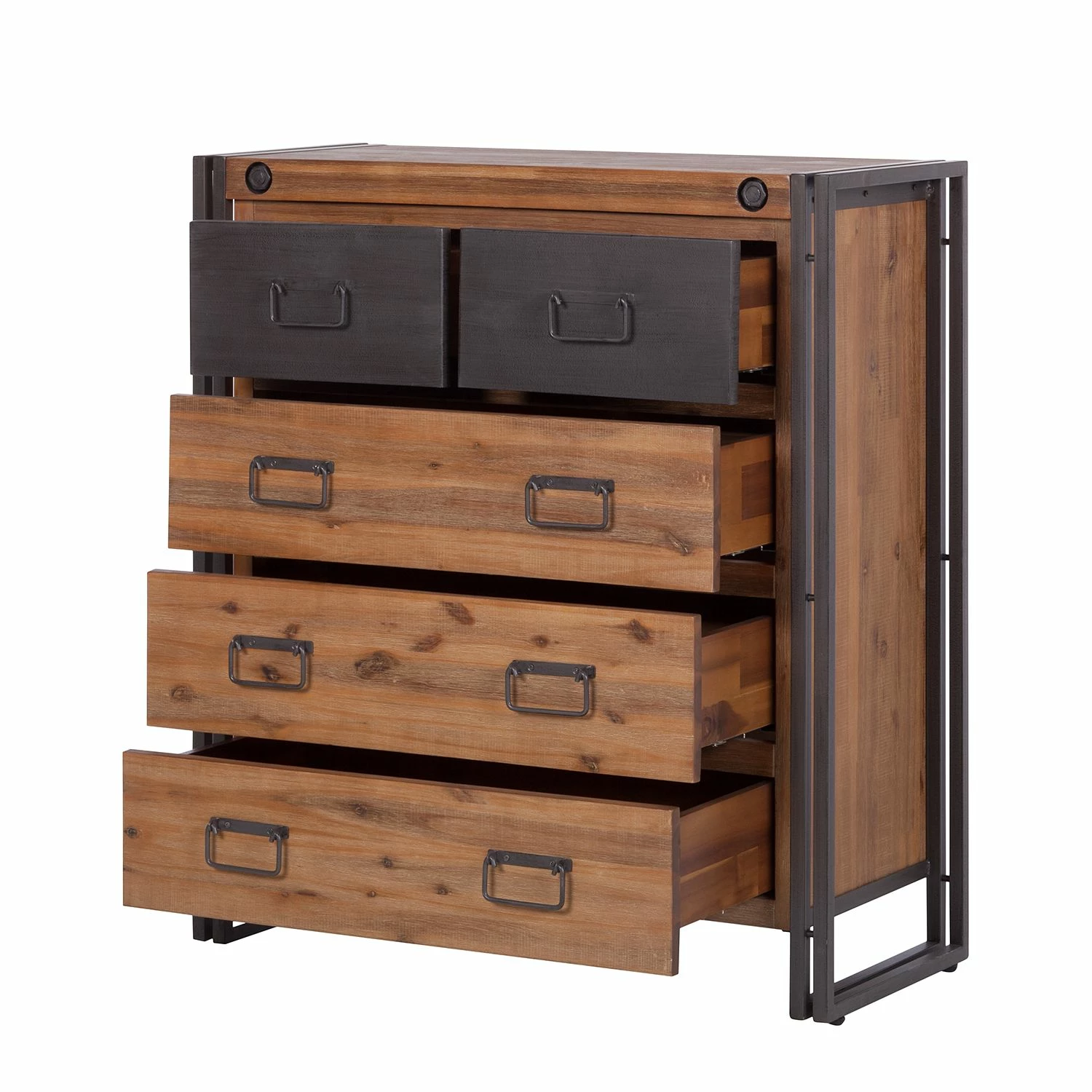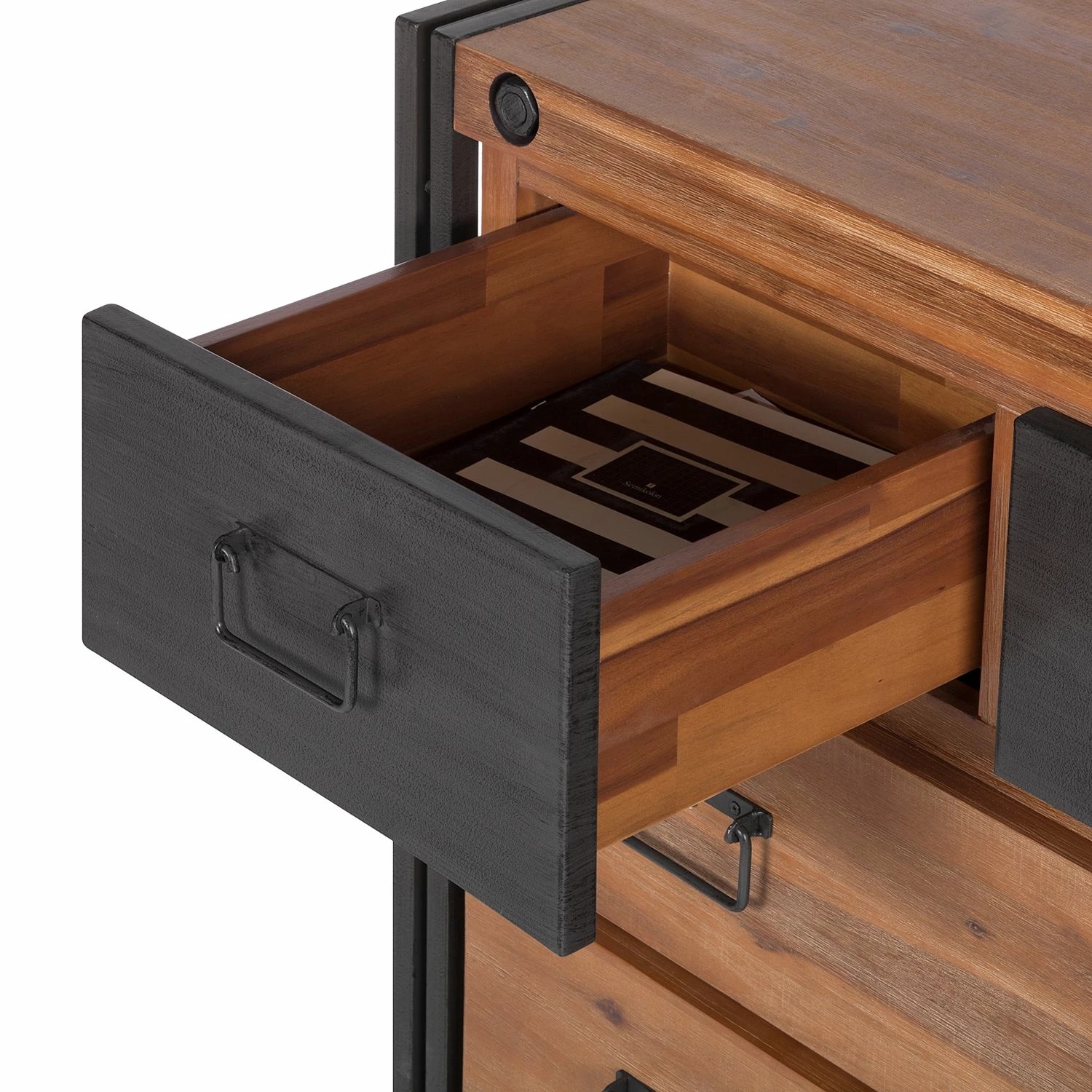 - Massivholz Akazie, gebürstet & lackiert Metall, beschichtet Kleine Schubladen: MDF (Mitteldichte Holzfaserplatte), furniert