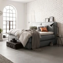 Dem mit grauen Webstoff bezogenem Boxspringbett Kinx sieht man auf den ersten Blick die Gemütlichkeit an. Ob in Verbindung mit einer modernen Einrichtung oder im klassischen Landhausstil, das attraktive Bett integriert sich problemlos und ist das Highlight in jedem Schlafbereich. Ein üppig gepolstertes hohes Kopfteil garantiert Komfort und Wohlgefühl. Die hohe Liegehöhe des Boxspringbettes Kinx ermöglicht einen angenehmen Ein- und Ausstieg und ein wohltuendes Liegegefühl. Attraktives Design und hochwertige Materialien machen das Bett zu einer echten Wohlfühloase.