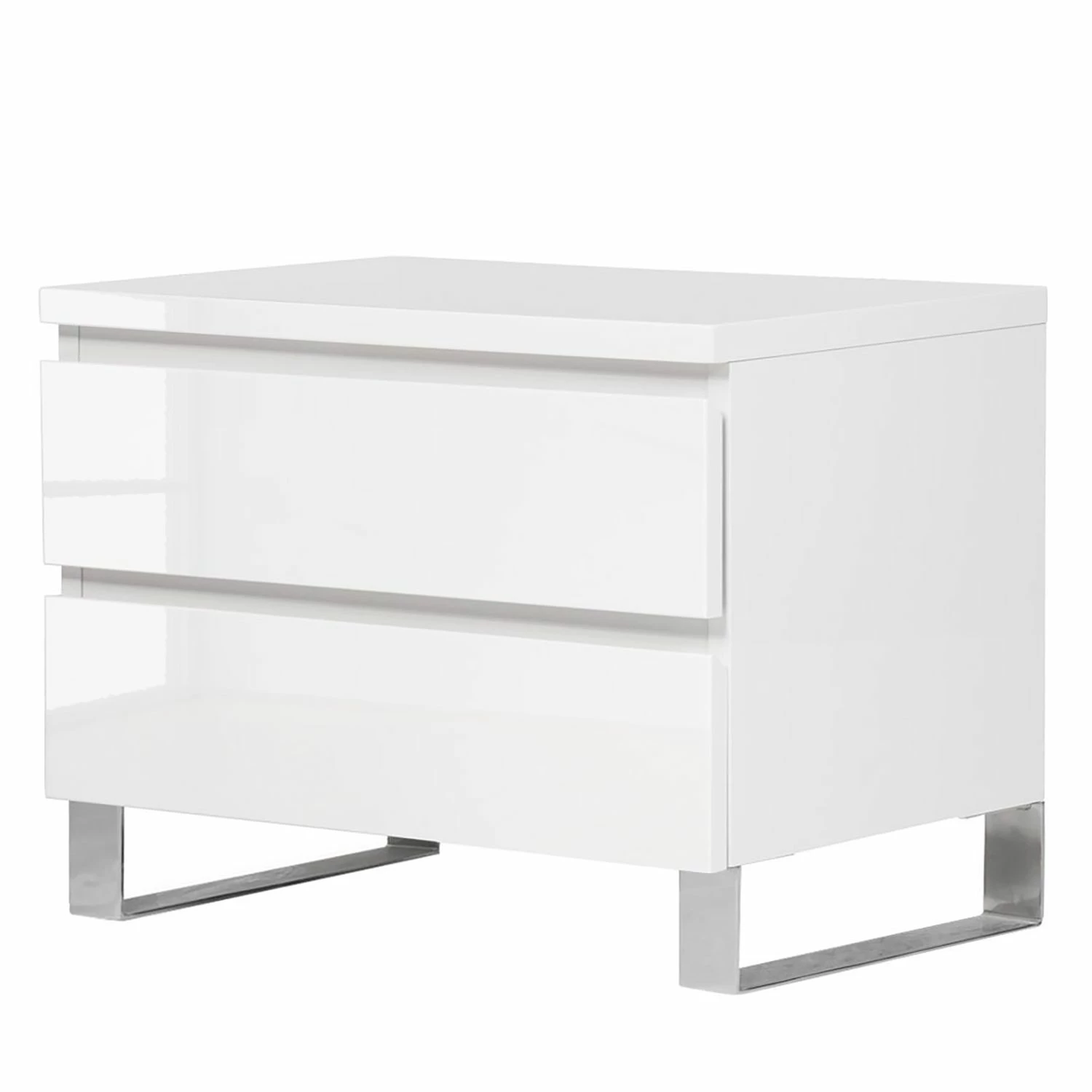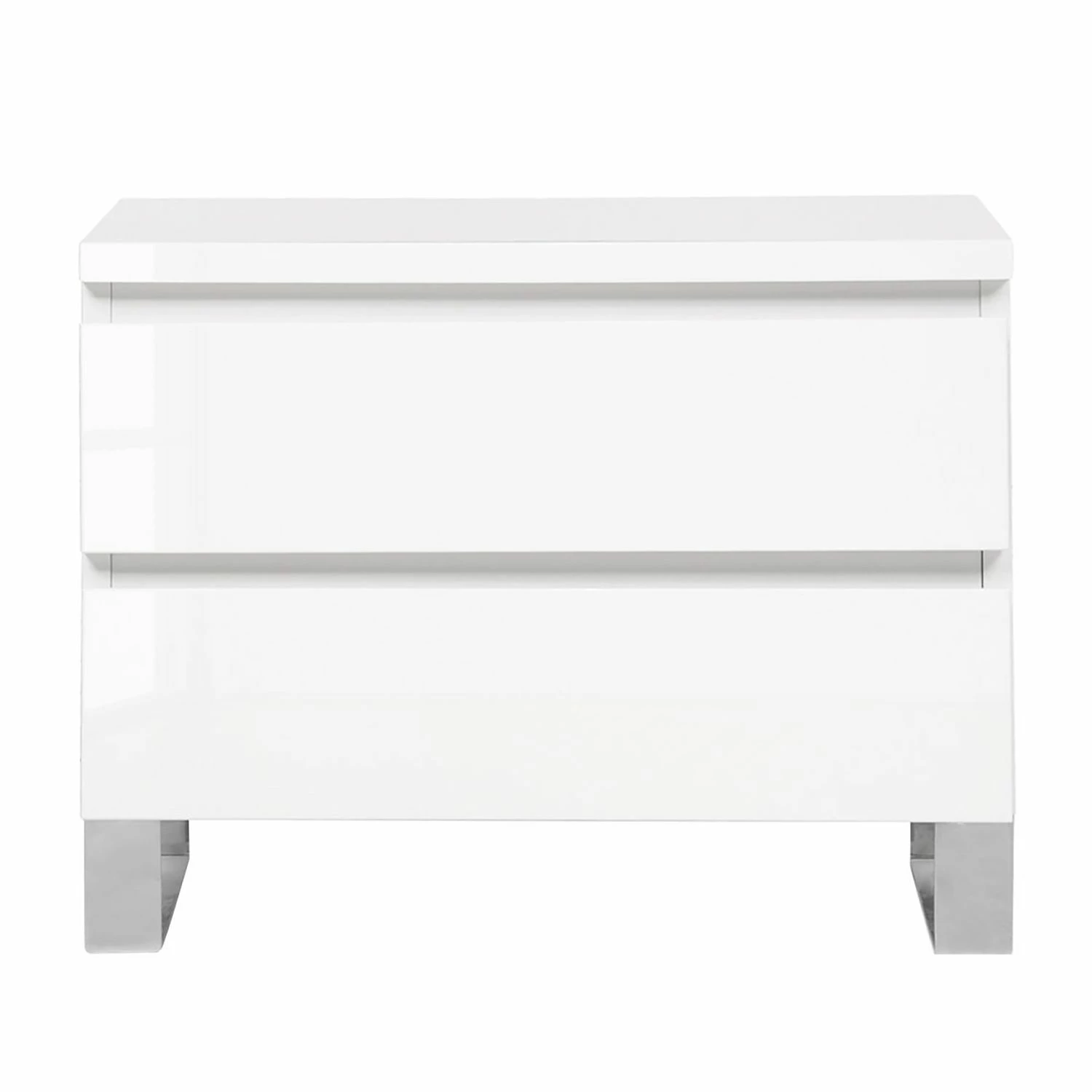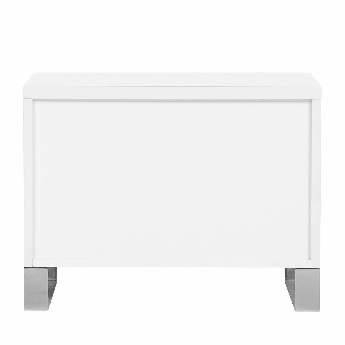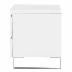 Die Nachtkommode Bianco I versprüht mit ihrem reduzierten und hochglänzenden Look modernes Flair im Schlafzimmer. Charakteristisch für dieses Möbelstück ist das Zusammenspiel aus den minimalistisch gestalteten Fronten und den bügelartigen Füßen aus Edelstahl. Puristisch geformte Lackmöbel passen gut zur Nachtkommode Bianco I. Eine schöne Kombination stellt zum Beispiel ein elegantes Boxspringbett mit einem großflächigen Kopfteil sowie ein hoher Schwebetürenschrank, der mit ausladend gestalteten Spiegelflächen versehen ist, dar. Die schicke Nachtkommode wartet mit zwei Schubladen auf.