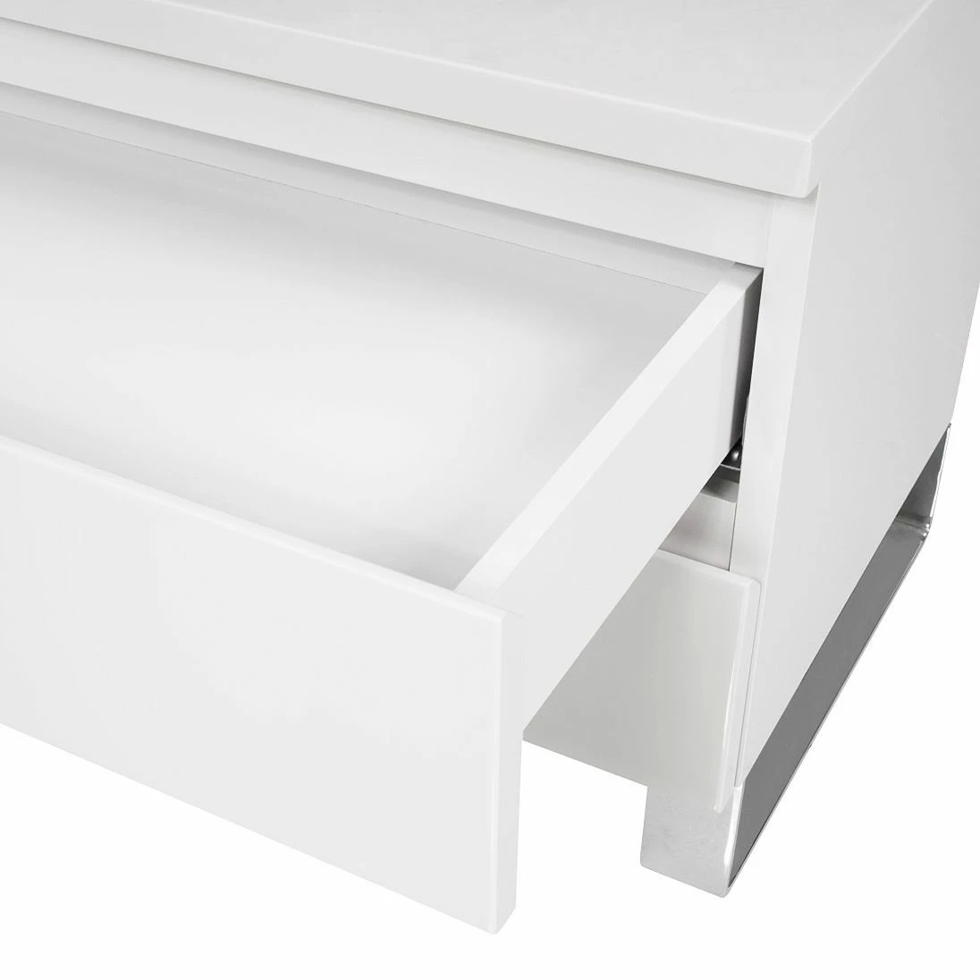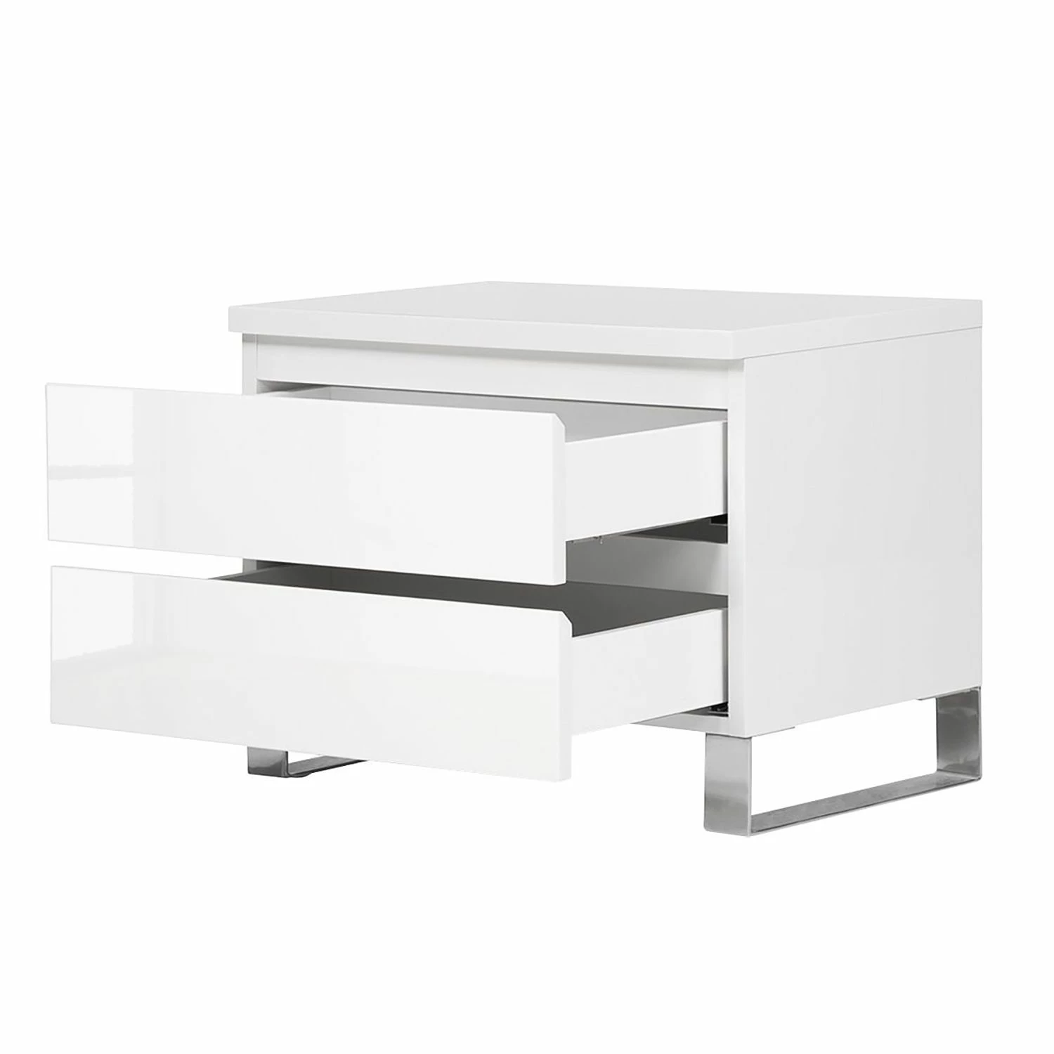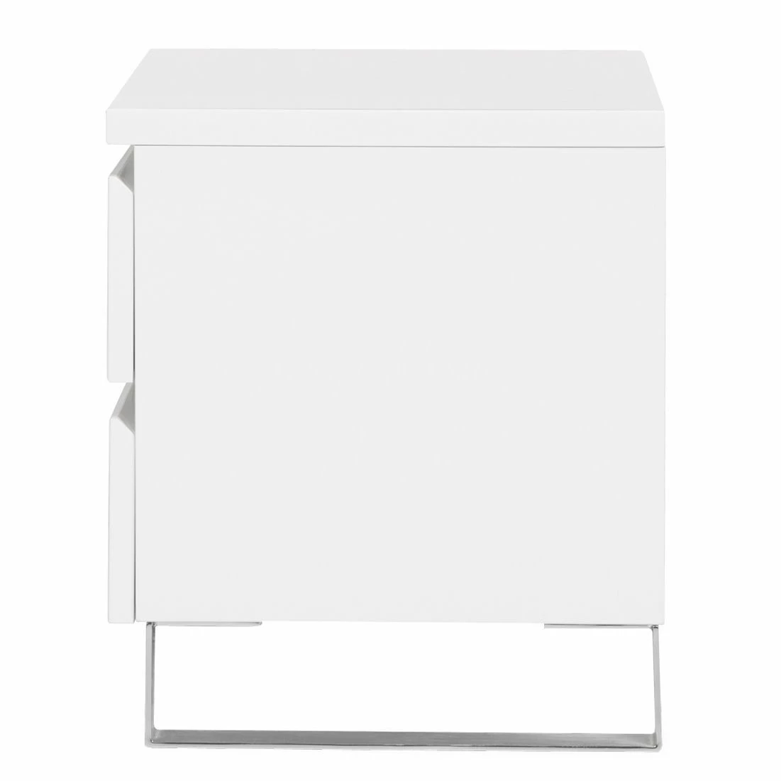 Die Nachtkommode Bianco I versprüht mit ihrem reduzierten und hochglänzenden Look modernes Flair im Schlafzimmer. Charakteristisch für dieses Möbelstück ist das Zusammenspiel aus den minimalistisch gestalteten Fronten und den bügelartigen Füßen aus Edelstahl. Puristisch geformte Lackmöbel passen gut zur Nachtkommode Bianco I. Eine schöne Kombination stellt zum Beispiel ein elegantes Boxspringbett mit einem großflächigen Kopfteil sowie ein hoher Schwebetürenschrank, der mit ausladend gestalteten Spiegelflächen versehen ist, dar. Die schicke Nachtkommode wartet mit zwei Schubladen auf.