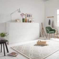 Das Schrankbett KiYDOO smart von KiYDOO ist ein Gästebett in ausgeklügeltem Design. Gefertigt aus weißer, melaminbeschichteter Spanplatte wirkt es unaufdringlich und edel. Die Formen sind klar und unkompliziert, wodurch das Bett zu einem zeitlosen Möbelstück wird. Das praktische Wandklappbett ist mit einem Lattenrost mit individueller Härteregelung im Mittelzonenbereich ausgestattet. Optional kann das Bett mit Schaumstoff-, Bonellfederkern- oder Kaltschaummatratze erworben werden. Das Schrankbett KiYDOO smart ist mit GS-Siegel für geprüfte Sicherheit ausgezeichnet und es wurden ausschließlich schadstoffgeprüfte Textilien nach Öko-Tex Standard 100 verarbeitet. Wird das Bett einmal nicht benötigt, verschwindet es mit einem Handgriff.