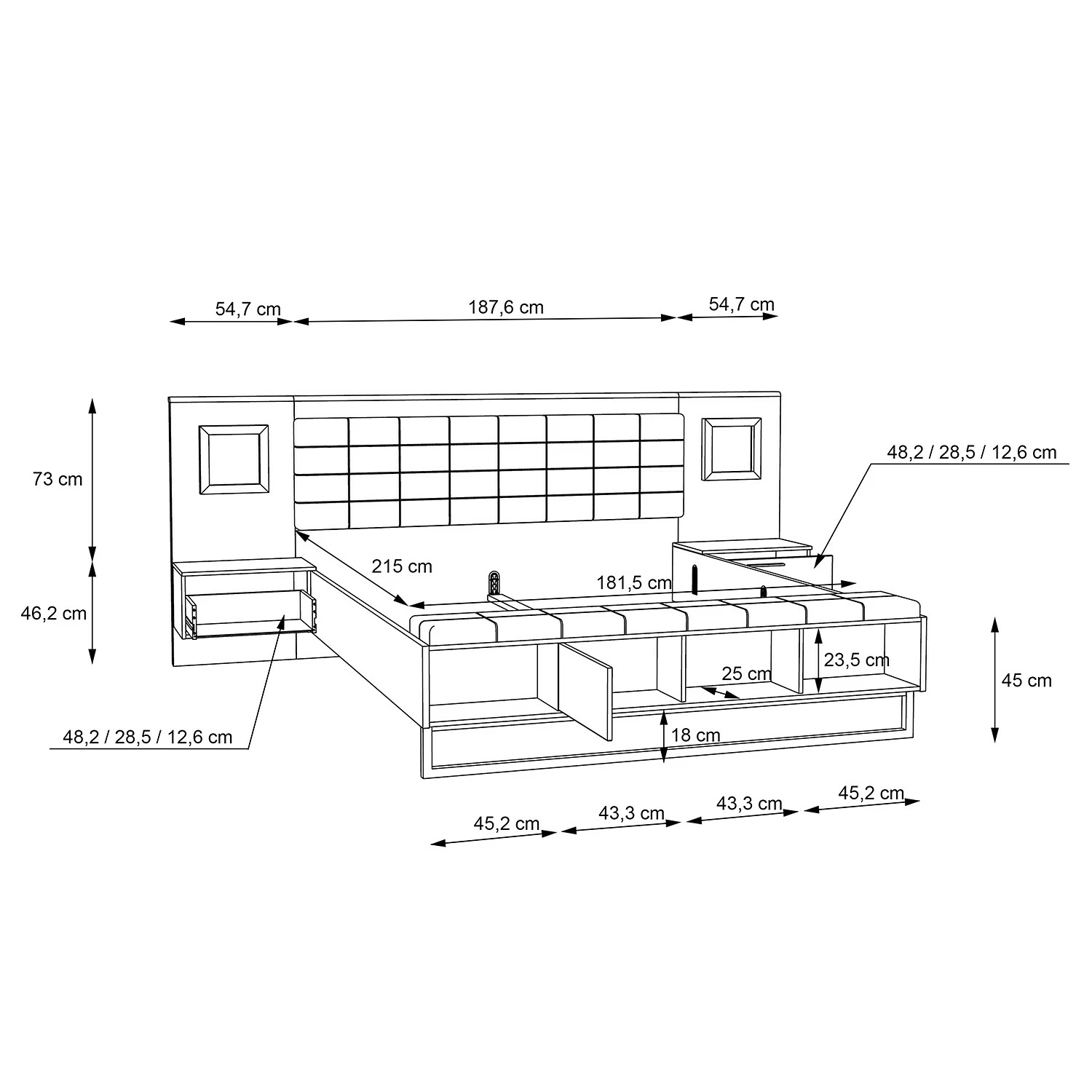 - Lieferumfang: Bettgestell inkl. 2 Nachtkommoden, ohne Dekoration