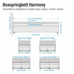 Das besondere an Boxspringbetten ist, dass sie nicht auf dem üblichen Bettrahmen-Lattenrost-Prinzip basieren, sondern einen speziellen Aufbau mit einer gefederten Unterbox und einem darüber liegenden Matratzensystem haben. Dieses Liegesystem passt sich Ihrem Körper perfekt an. Beim Boxspringbett Harmony haben Sie zusätzlich die Wahl zwischen drei verschiedenen Matratzentypen, die aus Bonellfederkern, Tonnentaschenfederkern oder 7-Zonen-Kaltschaumkern bestehen. Wahlweise können Sie sich für einen weicheren oder festeren Härtegrad entscheiden. Der Topper besteht aus punktelastischem Kaltschaum und ist mit einem abnehmbaren Dencel-Doppeltuchbezug bezogen, der in der Waschmaschine bei bis zu 60 Grad mitgewaschen werden kann. Weich gebettet und trotzdem gut gestützt – das System fördert nachhaltig Ihren gesunden Schlaf.