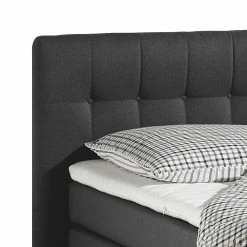 Der Unterbau ist aus massivem Holz gefertigt, das mit einem schönen Strukturstoff in Anthrazit überzogen wurde. Die Farbgebung beruhigt die Sinne und lässt den Eindruck von Zeitlosigkeit entstehen. Perfekt für das Schlafzimmer. Die dezente Knopfsteppung am aufwendig gepolsterten Kopfteil ist ein schönes Detail, das das puristische Design wunderbar betont. Die Unterpolsterung aus Bonellfederkern garantiert erstklassigen Liegekomfort, der in der Deluxe-Version von der hochklassigen 7-Zonen-Kaltschaummatratze unterstützt wird. Je nach Ihren persönlichen Vorlieben können Sie sich auch für eine Bonellfederkernmatratze oder eine 5-Zonen-Taschenfederkernmatratze entscheiden. Der Topper mit dem abnehmbaren TENCEL-Doppeltuchbezug sorgt für das i-Tüpfelchen an Bequemlichkeit.