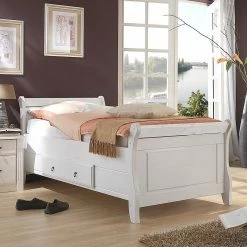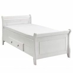 Für Einzelpersonen ist dieses weiße Bett perfekt geeignet. Mit einer Liegefläche von 100 x 200 cm passt es auch in kleinere Räume problemlos. Sie möchten in Ihrem Bett Bettwäsche und andere Dinge lagern? Kein Problem, dieses Modell verfügt über ausreichend Stauraum. Das Kiefernholz des Betts sorgt für ein natürliches Flair.