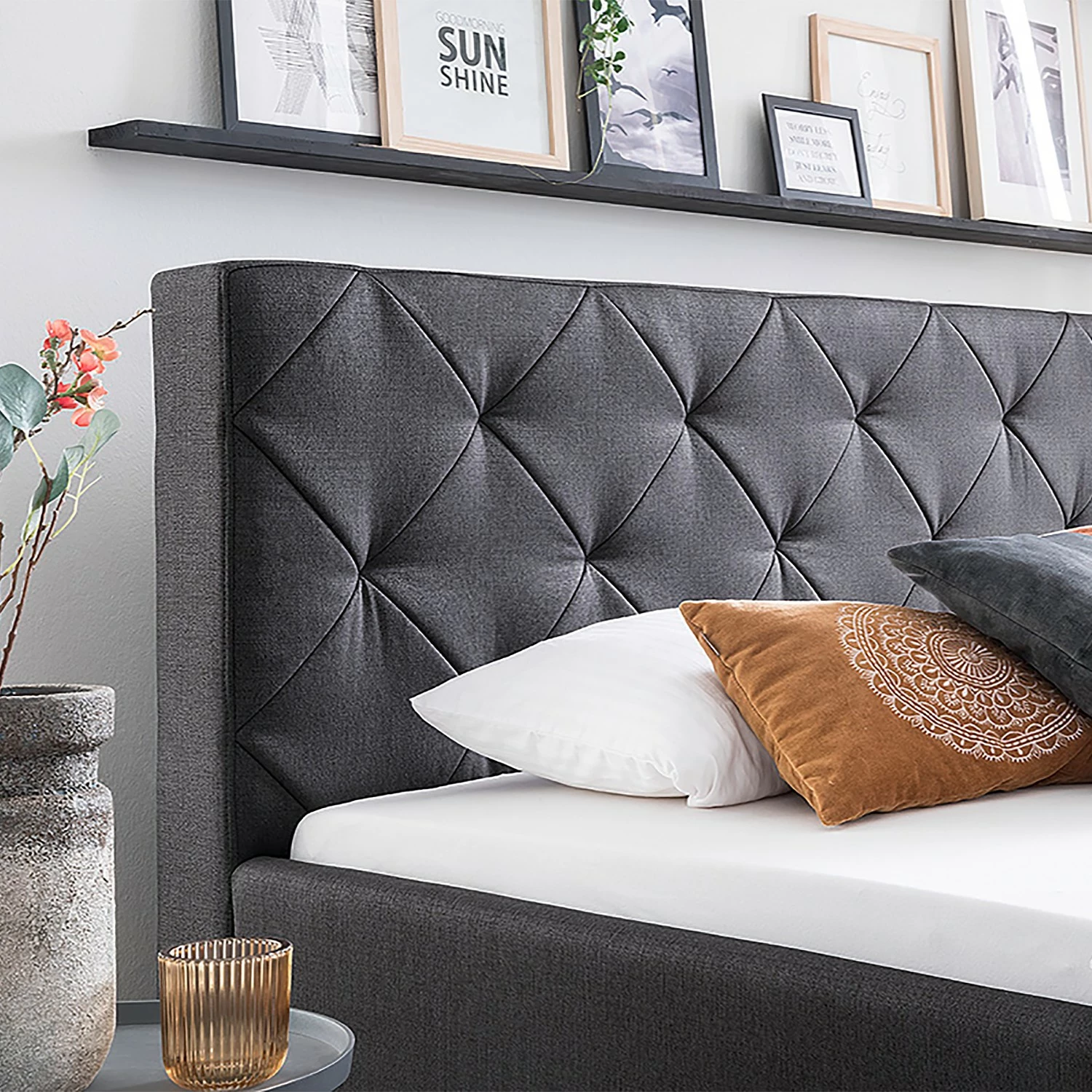 - Lieferumfang: Polsterbett ohne Lattenrost, Matratze & Dekoration