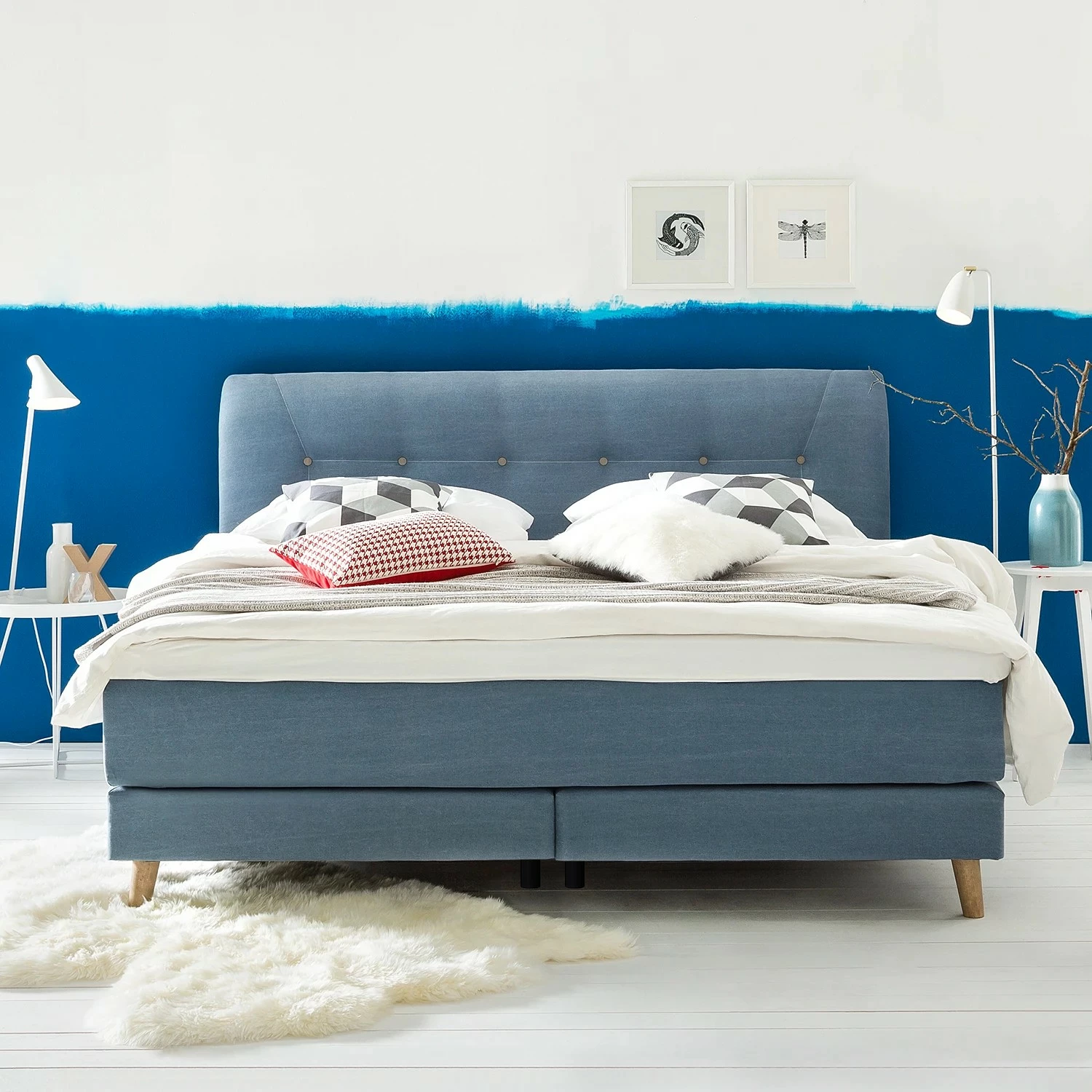 Boxspringbett Mälby bietet den unvergleichlichen Boxspringbett-Schlafkomfort und schafft es auch noch, das mit attraktivem Skandi-Chic zu verbinden. Die untere Federbox steht auf hübschen Füßen aus Massivholz, was dem Bett eine leichte Erscheinung verleiht. Dazu sind auf dem gepolsterten Kopfbrett hübsche Ziernähte und eine abgesetzte Knopfheftung eingearbeitet. Dank des Zusammenspiels aus zwei Matratzen mit Federkernen und dem weichen Visco-Schaumtopper bietet das Bett einfach traumhaften Liegekomfort.