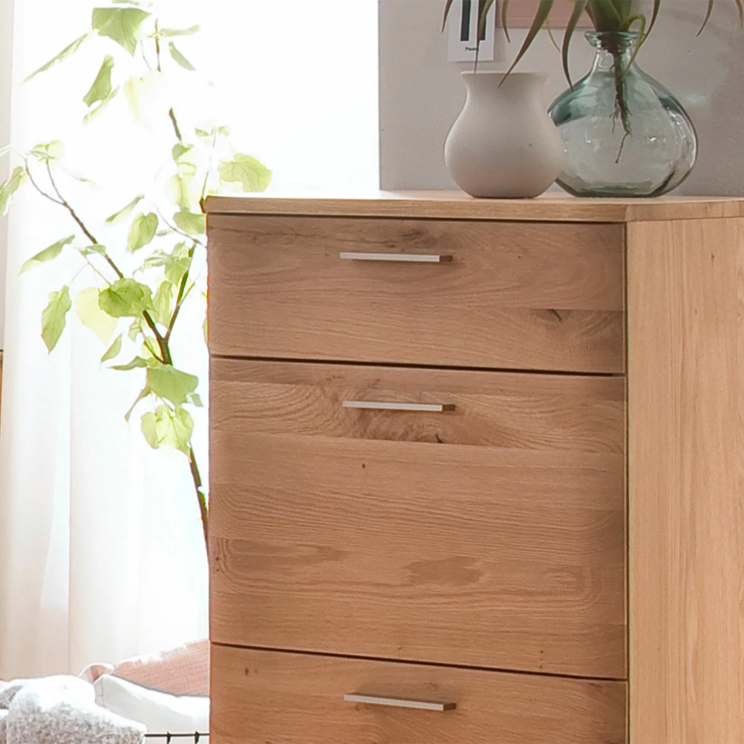 - Front: Massivholz Balkeneiche Bianco, geölt