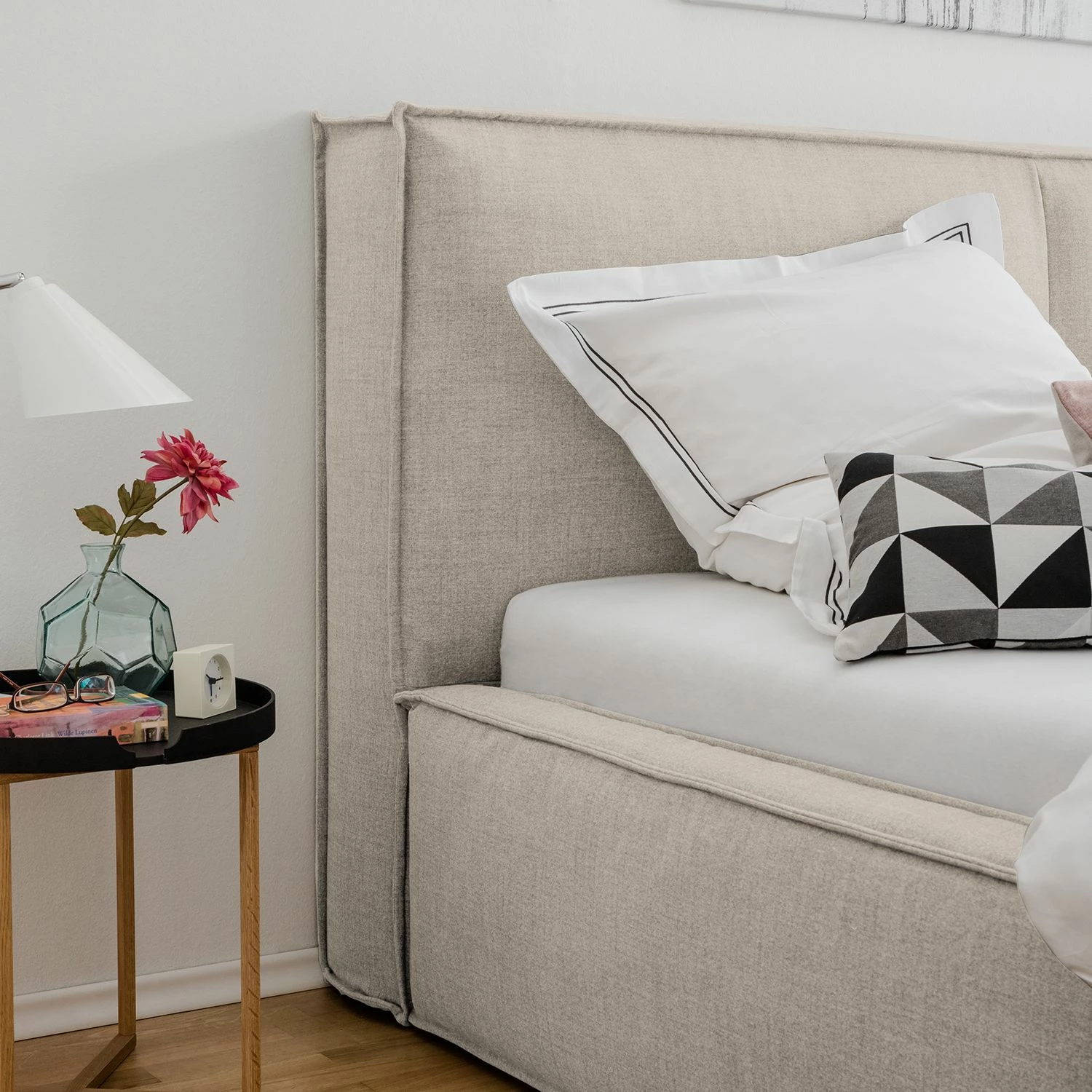 Dem textilbezogenen Polsterbett Kinx sieht man die Gemütlichkeit auf den ersten Blick an. Sein üppig gepolstertes hohes Kopfteil ist super bequem zum Anlehnen beim Lesen, Fernsehen oder Frühstück im Bett. Der rundumlaufende Klettbezug mit Hussen lässt den gesamten Rahmen wie aus einem Stück wirken. Ideal für die Ablage von Smartphone und TV-Fernbedienung ist der breite Rahmen, auf dem man sogar beim Anziehen sitzen kann. Die Einlegetiefe ist vierfach verstellbar, sodass sich das Bett für praktisch alle Matratzen- und Schlafsysteme eignet. Eine echte Wohlfühloase, die zum Highlight jedes Schlafzimmers wird!