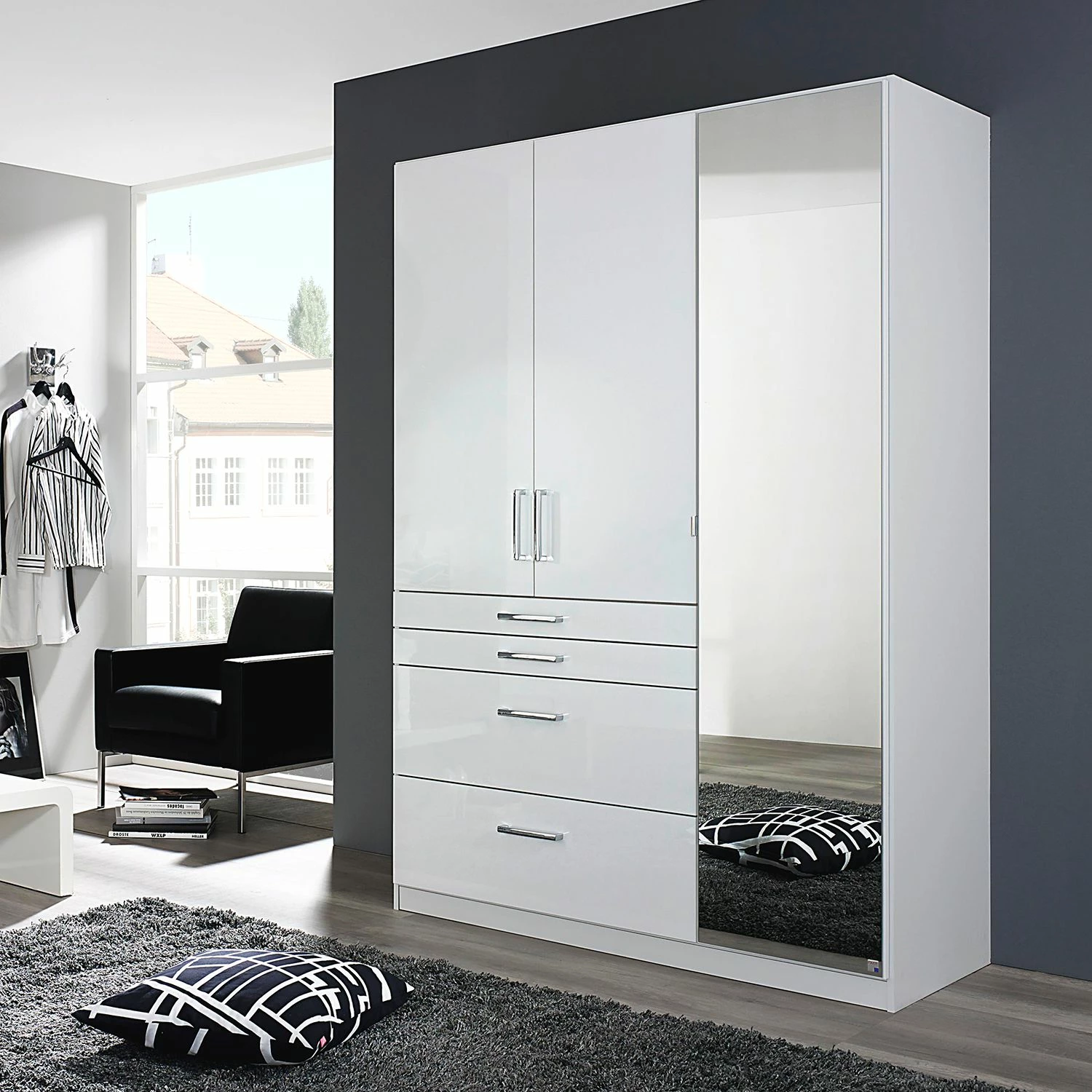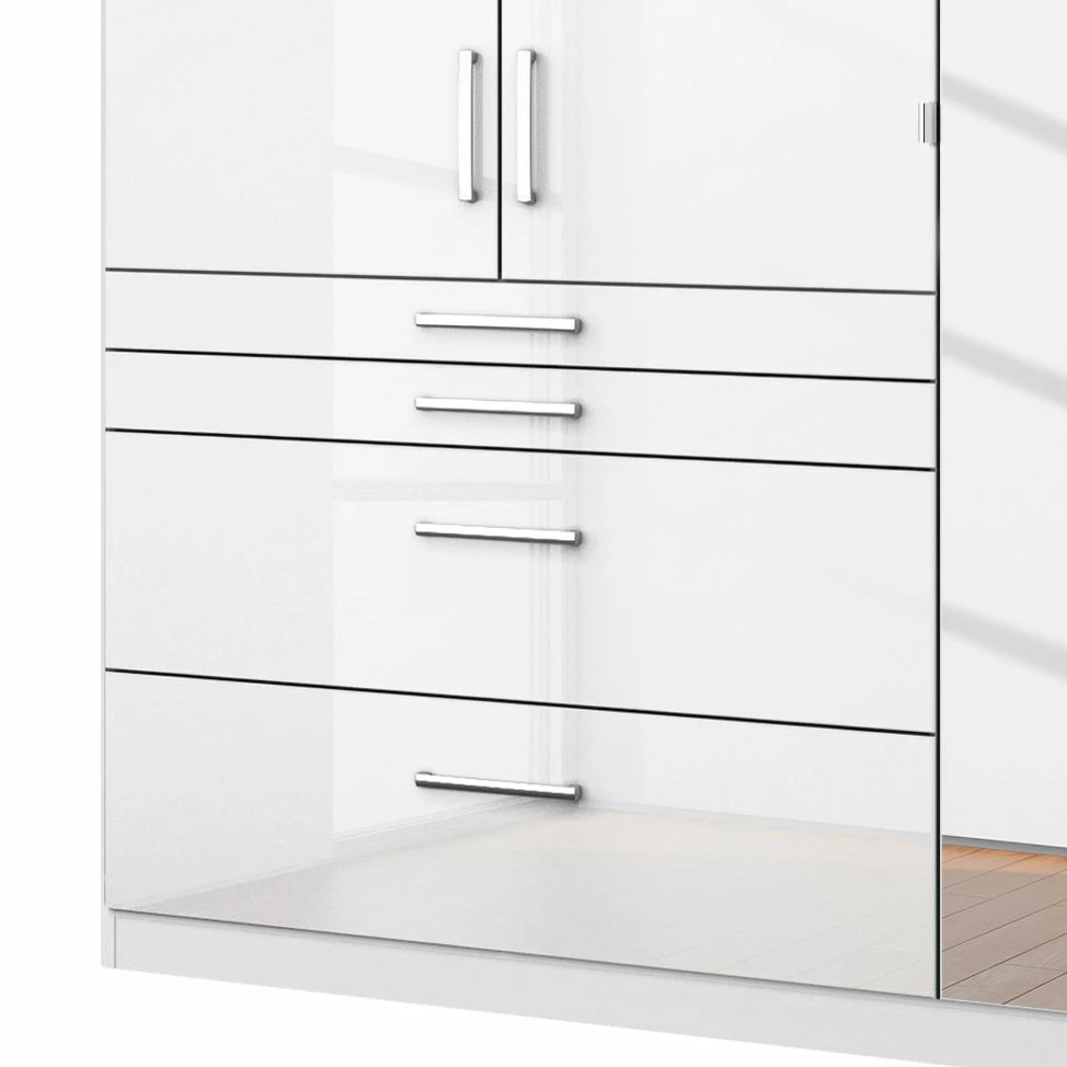 - Die rein weiße Front – auf Wunsch ergänzt mit Spiegeltüren – macht diesen Schrank universell kombinierbar.