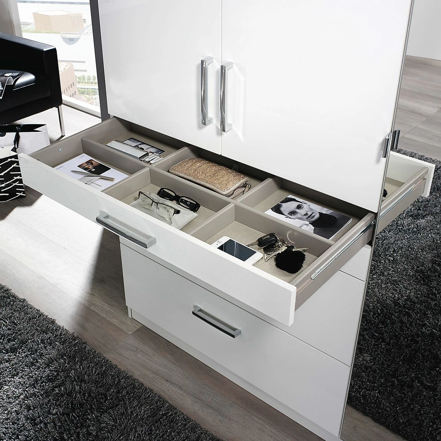 - Mit zahlreichen Unterteilungen und Schubladen lässt sich der Schrank übersichtlich und vielseitig organisieren.
