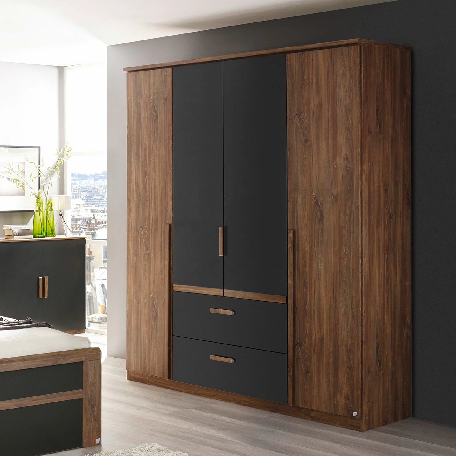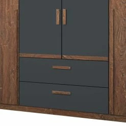 - Der Drehtürenschrank lebt von einem attraktiven Kontrast von grober Holzstruktur und glatten Flächen.