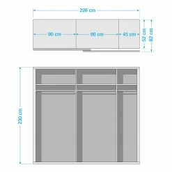 - Höhe 230 cm: Je 2 Fachböden & 1 Kleiderstange pro Schrankelement