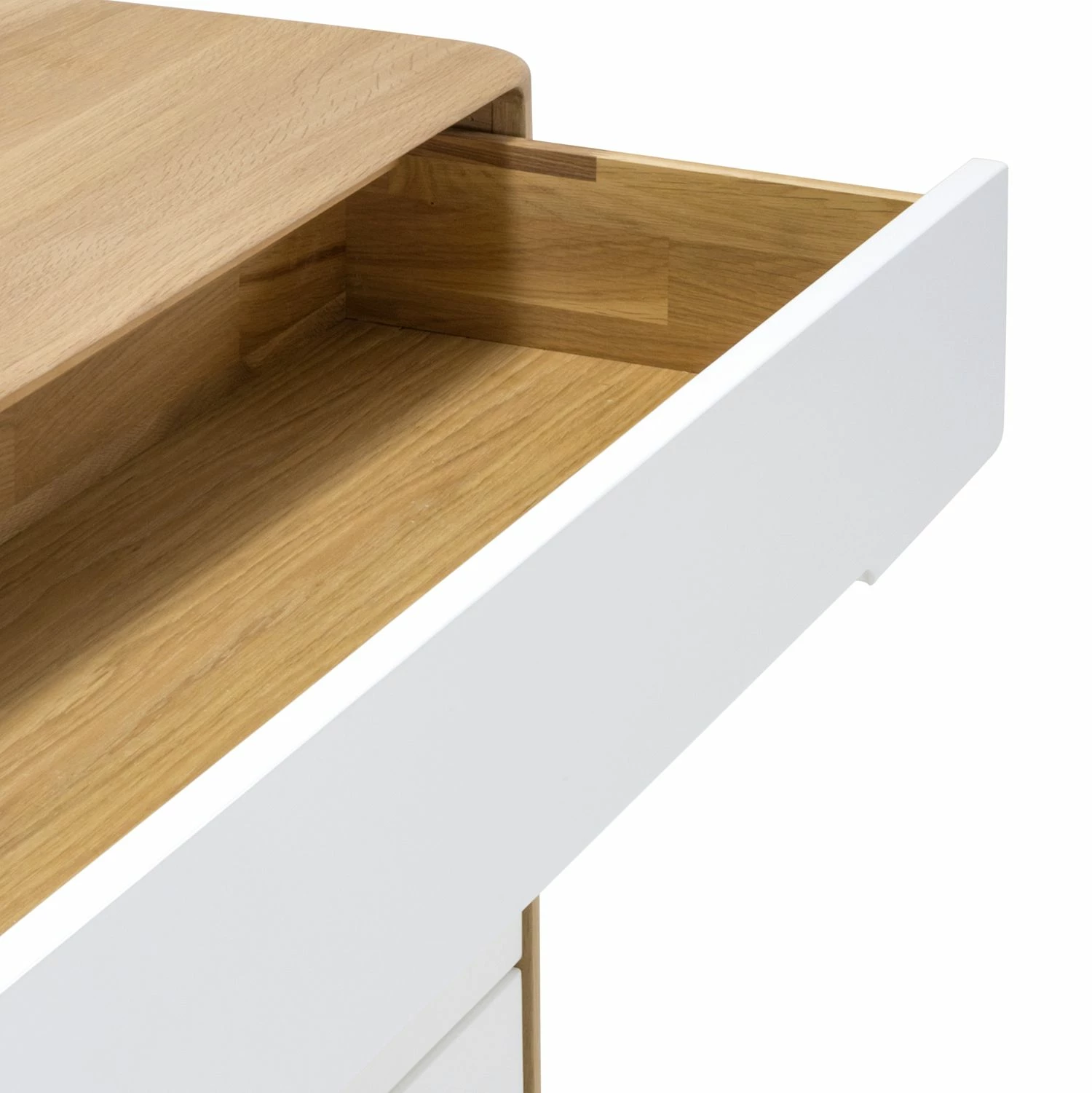 Vom Stil der 1960er-Jahre inspiriert hat der Designer Salih Teskeredžic diese Kommode Loca II entworfen, die vor allem aufgrund ihrer Geradlinigkeit und hochwertigen Materialien ins Auge fällt. Der Korpus und die leicht schräg gestellten Beine sind aus massiver Wildeiche gefertigt. Das Holz wurde geölt, sodass seine ganz eigene Maserung perfekt zur Geltung kommt. Die Front aus lackierter MDF-Platte setzt farblich einen schönen Kontrast dazu. Durch die sanft abgerundeten Kanten wird der stilvolle Entwurf des Möbels perfekt unterstrichen. Auch durch die minimalen länglichen Griffmulden der vier Schubladen, die mit einer praktischen Soft-Close-Funktion ausgestattet sind, kommt die geschmackvolle Gestaltung der Kommode Loca II zum Ausdruck.