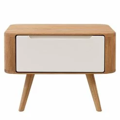 Inspiriert vom nordischen Design lässt die Nachtkommode Loca II die Einrichtung frisch und luftig-leicht wirken. Dazu tragen die langen schmalen Beine aus geölter Wildeiche sowie die helle lackierte Front aus MDF-Platten bei. Zudem unterstützt die gemaserte Oberfläche auf dem warmen Holz ein wohnliches Ambiente. Zur Aufbewahrung der Bettlektüre, der Brille und anderer Utensilien verfügt die Kommode über eine große Schublade. Der Clou daran ist die innen liegende Griffleiste. Dank der innovativen Soft-close-Funktion kann die Nachtkommode Loca II geräuscharm geschlossen werden. So weckt man seinen Partner nicht auf, wenn mal ein Taschentuch benötigt wird.