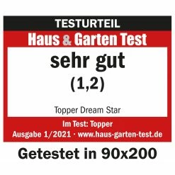 Dieser luxuriöse und softe Topper besticht durch seinen tollen Komfort – eine Bereicherung fĂĽr jede Matratze! Von Haus & Garten mit „sehr gut“ bewertet (Note 1,2 Ausgabe 01/2021, Größe 090x200cm getestet). Der verwendete Komfortschaum ist medium fest, hoch anschmiegsam und dabei sehr atmungsaktiv. Der Doppeltuch-Bezug „Silvercare“ hat eine antibakterielle Funktion und ist beidseitig mit Klimafaser versteppt. Er ist ĂĽber den 4-Seiten-ReiĂźverschluss abnehmbar und kann bei 60° in der Maschine gewaschen werden. Alle Materialien sind schadstoffgeprĂĽft nach Ă–kotex-Standard 100. Der Topper wird gerollt geliefert und benötigt ca. 24 Stunden um sich voll zu entfalten.