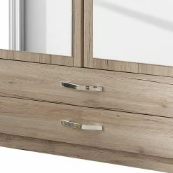 Durch den hohen Spiegel auf der Mitteltür und die außergewöhnlichen Griffe mit den chromfarbenen Zierleisten auf den Außentüren erhält das Schrankmodell beeindruckende Designakzente. In zwei Schubladen lassen sich von Socken bis zu Handschuhen kleine Wäschestücke oder Utensilien unterbringen.