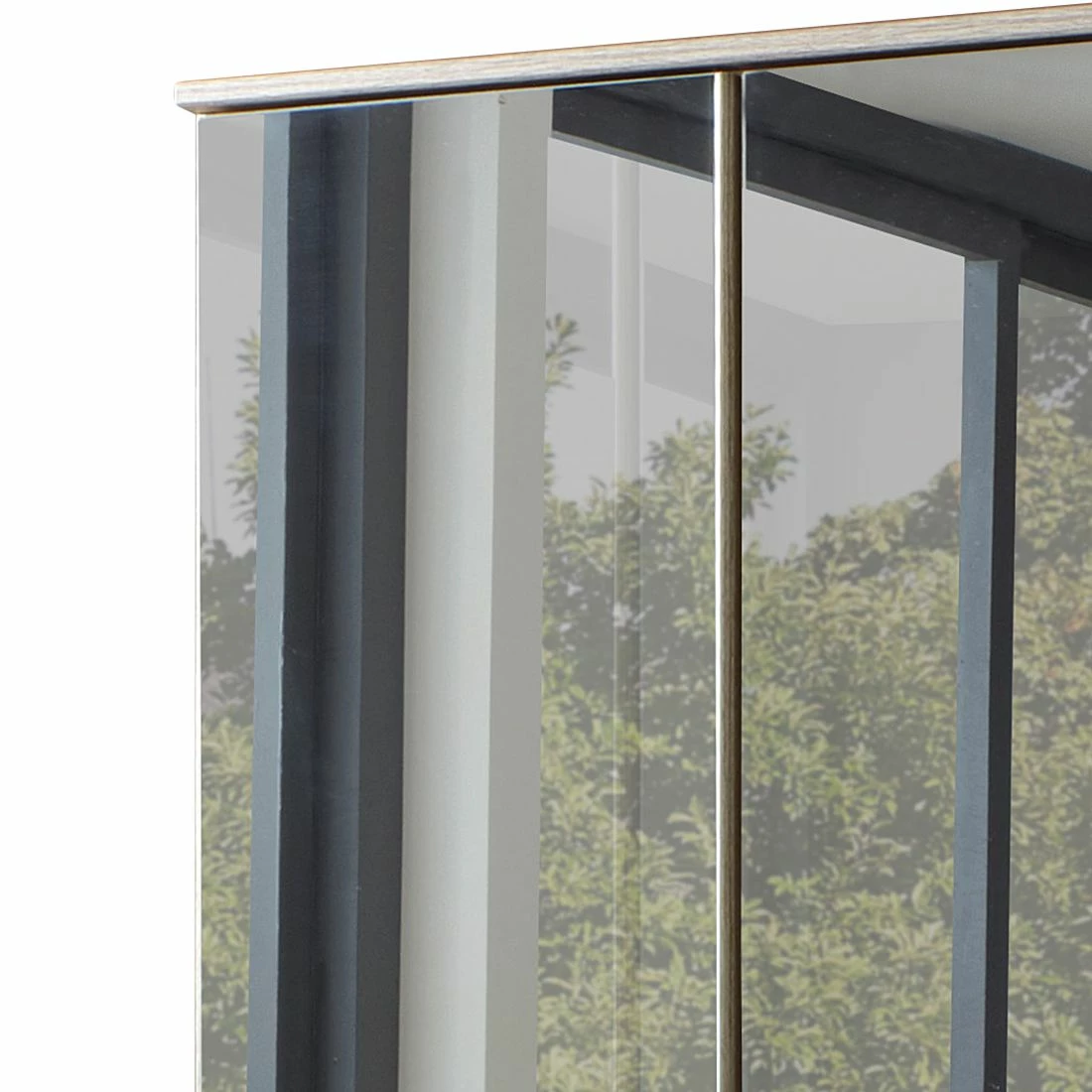 Der Drehtürenschrank Rajmi ist entweder mit zwei, drei oder vier Türen erhältlich und hat dem entsprechend unterschiedliche Ausstattungs Varianten, deren Details Sie der nebenstehenden Aufstellung entnehmen können. Gefertigt werden alle Ausführungen aus hochwertigen Gütespanplatten der Klasse E1, die sich durch besondere Robustheit und Stabilität auszeichnen. Beschichtet sind sie mit pflegeleichten und strapazierfähigen Dekorfolien im aktuell besonders beliebten Dekor Eiche sägerau. Die Türen sind im oberen Bereich mit hochwertigen Kristallspiegeln versehen, die es ermöglichen, das Aussehen der angelegten Garderobe direkt zu überprüfen. Darüber hinaus verfügt der in Deutschland hergestellte Schrank über stabile Scharniere und Kleiderstangen aus Metall, die durch eine lange Lebensdauer überzeugen.
