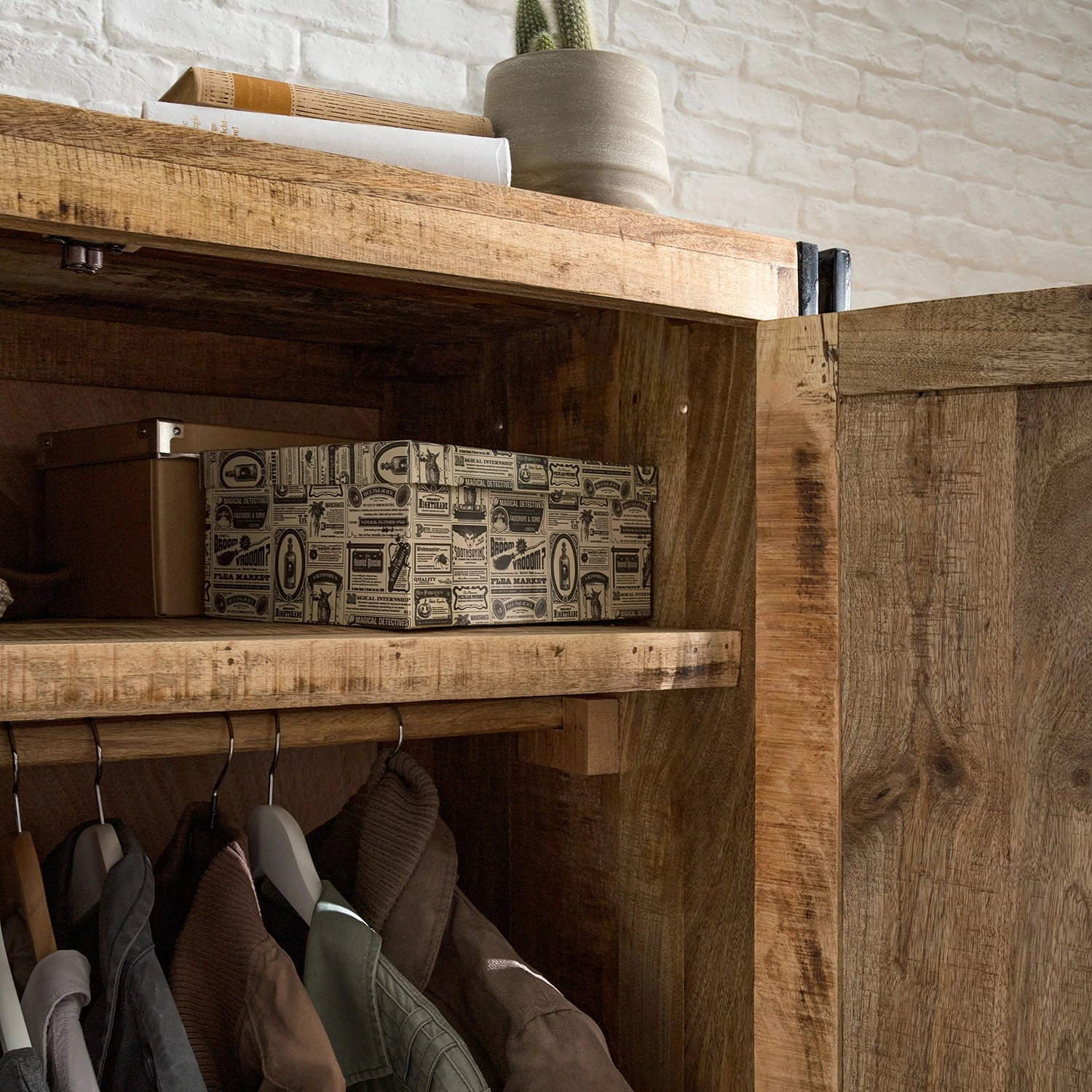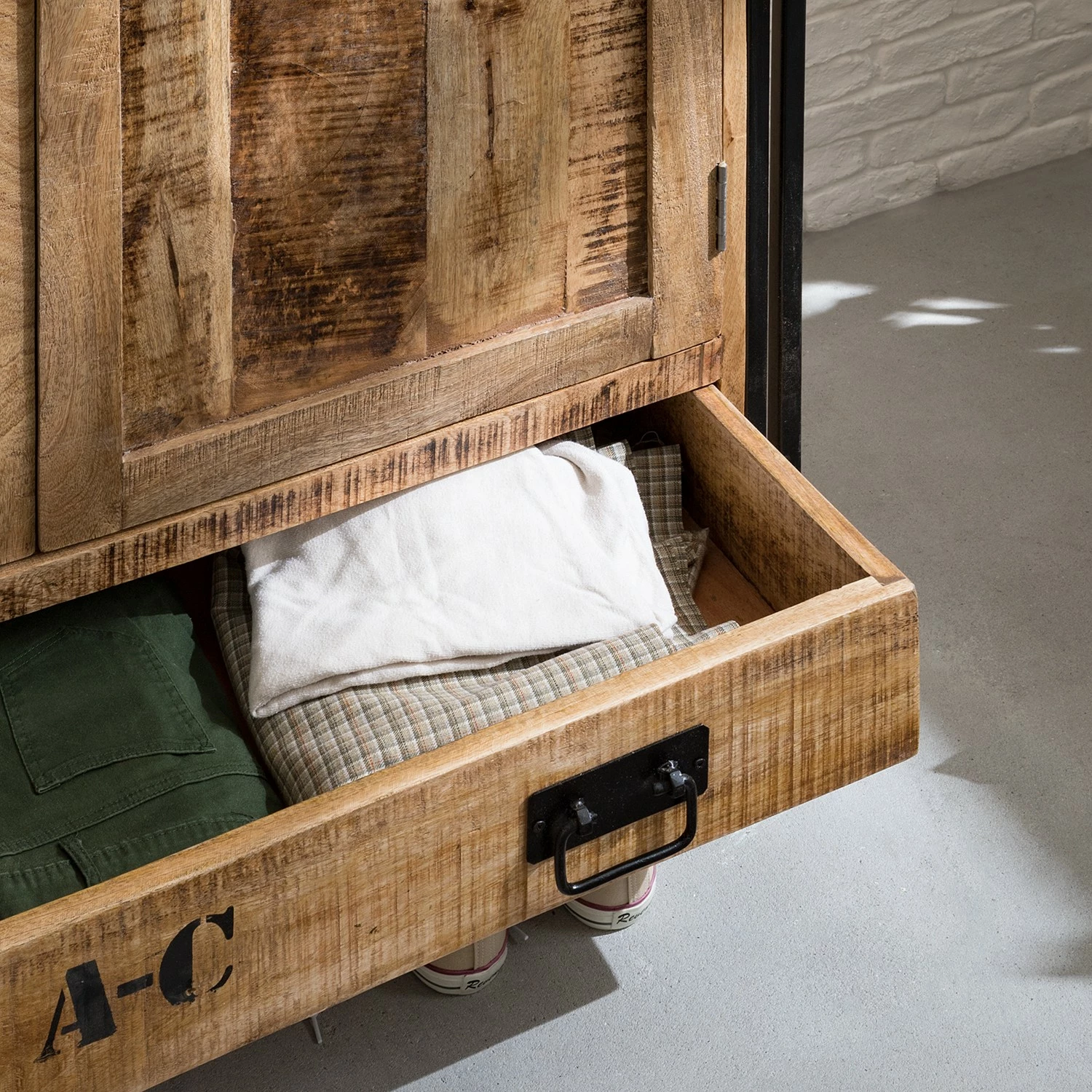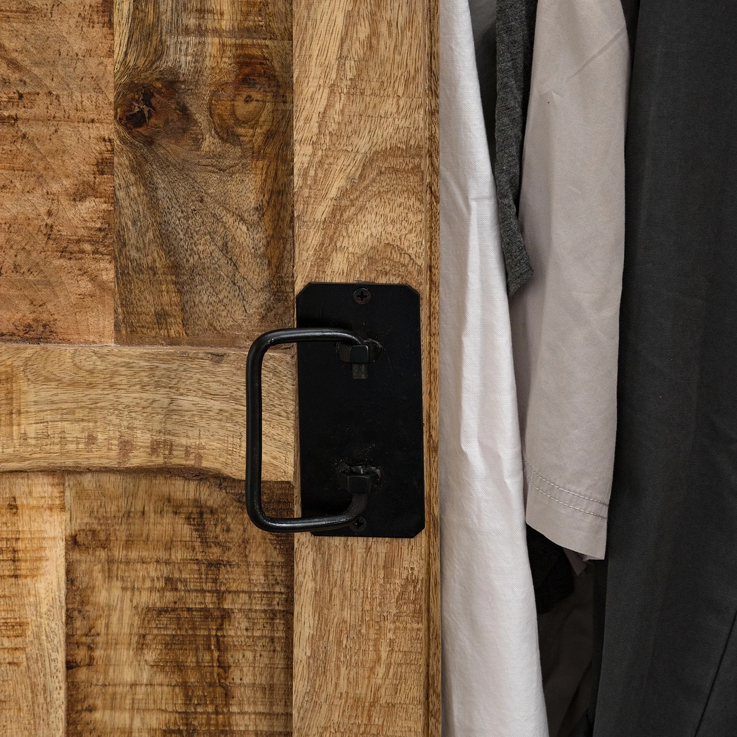 Der Drehtürenschrank Iron gehört zur Grundausstattung für einen Industrial Wohnstil. Der Schrank besteht aus massivem Mangoholz, das von Bäumen auf kontrollierten indischen Plantagen gewonnen wurde. Mit seinen 4 Fachböden, den 2 Kleiderstangen und einer Schublade bietet der Drehtürenschrank Iron ausreichend Stauraum für viel Kleidung. Seine rustikale Holz-Optik in Kombination mit dem Eisengestell sorgt für ein charakteristisches Design. Dabei wird bei der Herstellung auf Handarbeit Wert gelegt, um die Qualität des Holzes und die natürlich gemaserte Oberfläche zu erhalten.